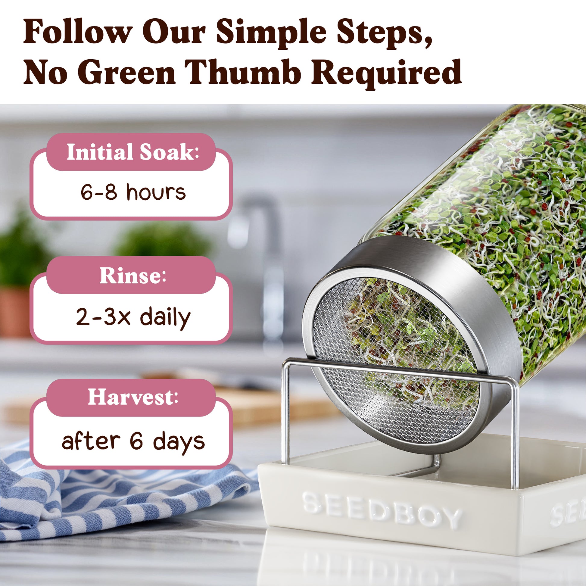 On day 3 I noticed white fuzzy stuff all over the roots and threw the whole batch out. I looked it up after and I guess those might have been root hairs not mold?? But I wasnt about to risk it. They looked gross and I didnt feel comfortable eating them. I tried a second batch and the same thing happned. Maybe im doing something wrong but for 15 dollars I expected a better experience.
